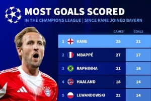 體育資訊9月18日訊 據(jù)德國轉(zhuǎn)會市場統(tǒng)計,凱恩加盟拜仁以來出戰(zhàn)25場歐冠比賽,打進21球,他是同期歐冠進球最多的球員。