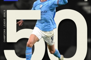 體育資訊9月19日訊 哈蘭德代表曼城在歐冠對(duì)陣那不勒斯的比賽中破門,打進(jìn)個(gè)人歐冠50球。