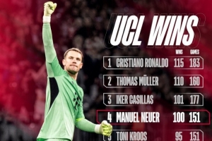 體育資訊9月19日訊 拜仁在昨晚的歐冠焦點戰(zhàn)3-1力克切爾西,諾伊爾成為歷史第4位歐冠100勝球員。拜仁官方也列出了歐冠歷史勝場榜紀錄。