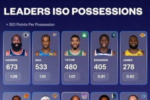而這10人中,單打每回合平均得分最多的球員是杜蘭特,他每次單打平均可以拿到1.16分,第二的是亞歷山大的1.10分,第三的是布倫森的1.07分。