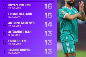 2025年英超參與進(jìn)球榜:薩拉赫20球居首,姆伯莫次席,哈蘭德第三