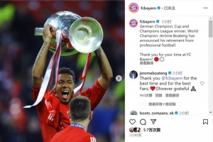 拜仁官方社媒曬出博阿滕效力球隊期間捧起歐冠獎杯的照片,并寫道:“德甲冠軍、德國杯冠軍、歐冠冠軍、世界冠軍,博阿滕已經(jīng)宣布退役。感謝你在拜仁的時光!”