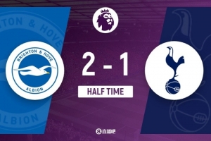 傷停補(bǔ)時3分鐘。上半場比賽結(jié)束,布萊頓2-1熱刺。