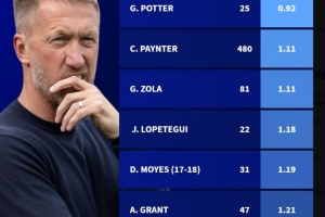 體育資訊9月21日訊 英超第5輪比賽,西漢姆聯(lián)在主場以1-2的比分不敵水晶宮,格拉漢姆-波特遭遇下課危機(jī)。根據(jù)數(shù)據(jù)統(tǒng)計,波特是西漢姆聯(lián)隊史拿分率最低的主教練,場均僅能拿到0.92分。