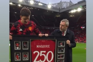 此役是馬奎爾為曼聯(lián)出戰(zhàn)的第250場比賽,B費社媒曬出馬奎爾領取紀念球衣的視頻,配文:“重大成就,當之無愧,大個子?!?/p>
