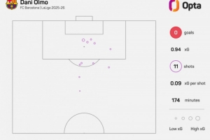 本賽季,奧爾莫在西甲中11腳射門均未能破門得分。在沒有取得進(jìn)球的球員中,僅伊納基-威廉姆斯和阿斯普里拉所用射門次數(shù)更多。