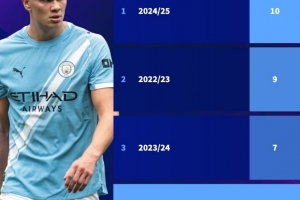 哈蘭德本賽季在前5輪英超打進(jìn)6球,但這已經(jīng)是他加盟曼城后前5場英超最低進(jìn)球數(shù)據(jù),他在24/25賽季同期10球,22/23賽季9球,23/24賽季則是7球。