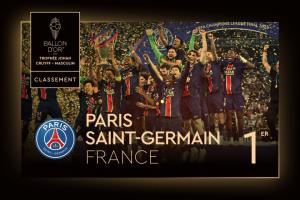 體育資訊9月23日訊 金球獎?lì)C獎典禮,巴黎圣日耳曼當(dāng)選最佳男足俱樂部。