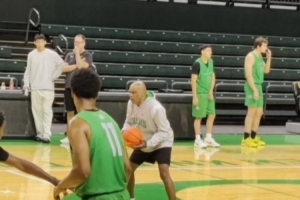 體育資訊9月23日訊 有俄勒岡大學(xué)籃球隊粉絲發(fā)布了一張球隊在主場球館訓(xùn)練的照片,從照片中可以看到除了在訓(xùn)練的隊員之外,場邊還站著穿著便裝的林葳。