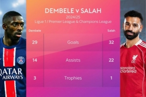 日前,英媒《天空體育》對比了登貝萊、薩拉赫2024/25賽季在聯(lián)賽和歐冠的數(shù)據(jù)。