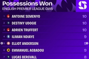 英超第5輪奪回球權(quán)榜:塞梅尼奧、烏多吉、特呂費爾10次居首