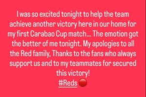 賽后,埃基蒂克在社媒向利物浦球迷道歉:“今晚能首次參加聯(lián)賽杯主場(chǎng)賽事并幫助球隊(duì)再奪勝利,我無(wú)比激動(dòng)……但今夜情緒確實(shí)有些失控。在此向所有紅軍大家庭致歉,也感謝一直支持我們的球迷,以及攜手贏(yíng)下比賽的隊(duì)友們!”