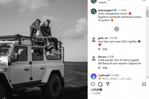 在社交媒體上,特爾施特根曬出了兩人坐在一輛越野車頂?shù)奶鹈壅?,并寫道:親愛的,生日快樂!讓我們一起經(jīng)歷更多的冒險!愛你呦!