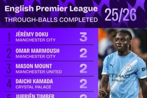 體育資訊9月24日訊 本賽季英超戰(zhàn)罷5輪,“Squawka”統(tǒng)計了所有球員成功完成直塞次數的排名,曼城邊鋒多庫以3次領跑。