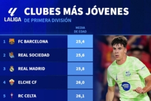 體育資訊9月24日訊 德轉(zhuǎn)統(tǒng)計(jì)了本賽季西甲球隊(duì)的平均年齡榜,巴薩平均年齡25.4歲最年輕,皇馬25.8歲第三年輕。