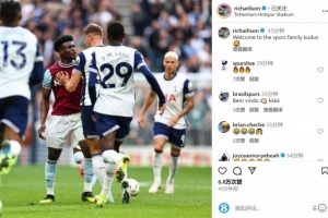 熱刺前鋒理查利森更新社媒動(dòng)態(tài),曬出庫杜斯與熱刺球員在球場(chǎng)上發(fā)生沖突的照片,配文:“歡迎加入熱刺大家庭,庫杜斯??”