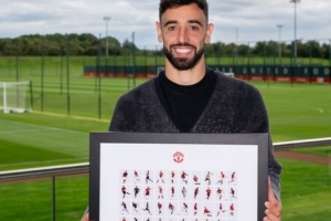 曼聯(lián)官方社媒曬圖,B費(fèi)獲得100球的紀(jì)念品,一個由100個B費(fèi)卡通圖案組成的紀(jì)念框。