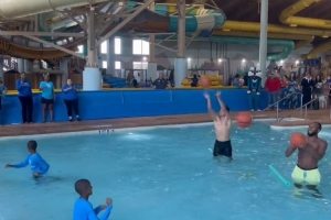 兩人在泳池進行投籃PK,為Boys & Girls Club of Greater Houston俱樂部籌集了1萬美元的善款。