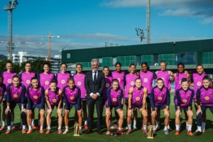 在體育城訓練場上,巴薩女足球員們與俱樂部官員哈維爾-普伊一起合影,身旁擺放著三項重要獎杯:邦馬蒂連續(xù)第三次獲得金球獎、維姬-洛佩茲贏得首屆科帕獎以及埃瓦-帕喬爾榮獲首個蓋德-穆勒獎。