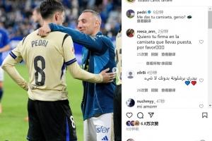 巴薩中場佩德里更新社媒動態(tài),曬出與皇家奧維耶多40歲中場卡索拉的賽后合照,對其表達(dá)敬意,配文:“天才,能把你的球衣給我嗎?”