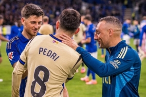 巴薩中場佩德里賽后與皇家奧維耶多40歲中場卡索拉交流,巴薩官方社媒曬出視頻,配文:“兩位球場魔術(shù)師?!?/p>
