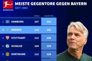自1963年德甲開賽以來面對(duì)拜仁丟球最多的球隊(duì)排名:
