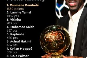 體育資訊09月27日訊 金球獎分數(shù)公布:登貝萊1380分第一,亞馬爾1059分。