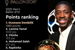 登貝萊1380分第一,第二位亞馬爾1059分。登貝萊獲得了73張第一選票。