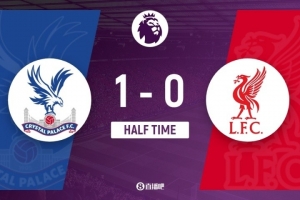 傷停補(bǔ)時(shí)10分鐘。上半場比賽結(jié)束,水晶宮1-0利物浦。