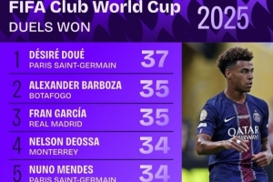 體育資訊7月11日訊 本屆世俱杯僅剩巴黎vs切爾西的決賽,數(shù)據(jù)機構squakwa也統(tǒng)計了本屆賽事成功對抗情況,巴黎20歲前鋒杜埃領跑。