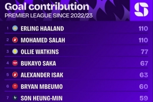 據(jù)Squawka的數(shù)據(jù)統(tǒng)計,自哈蘭德加盟曼城以來,他已經(jīng)在英超聯(lián)賽直接參與110粒進(jìn)球,同期沒有哪名球員比他更多,只有薩拉赫同樣參與110粒進(jìn)球與他持平。