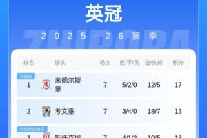 積分榜方面,米德爾斯堡5勝2平領(lǐng)跑,蘭帕德執(zhí)教的考文垂3勝4平排在第二。萊斯特城第5,伊普斯維奇少賽1場(chǎng)排在第12。