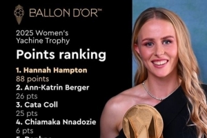 體育資訊9月28日訊 《法國足球》公布了2025年首屆女足雅辛獎(jiǎng)的投票結(jié)果,英格蘭國家隊(duì)兼切爾西門將漢娜-漢普頓以壓倒性優(yōu)勢(shì)歷史性地奪得該獎(jiǎng)項(xiàng)。