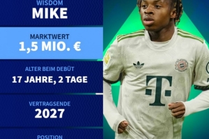 體育資訊9月28日訊 在本輪德甲拜仁4-0大勝不萊梅的比賽中,17歲小將麥克替補(bǔ)登場(chǎng)迎來一線隊(duì)首秀。