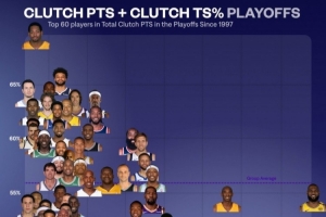 體育資訊9月29日訊 近日,數(shù)據(jù)媒體NBA University總結(jié)了自從1997年以來(lái)(NBA官網(wǎng)該項(xiàng)數(shù)據(jù)統(tǒng)計(jì)起始時(shí)間)在NBA季后賽中關(guān)鍵得分前60球員的真實(shí)命中率分布圖表。