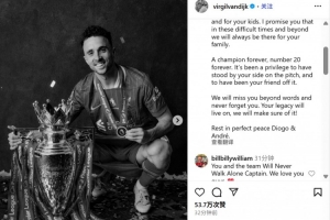 體育資訊7月4日訊 利物浦前鋒若塔因車禍去世,年僅28歲。利物浦隊(duì)長范迪克也通過社媒撰文送上悼念: