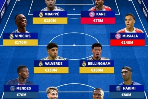 中場(chǎng):維尼修斯(皇馬,1.7億)、巴爾韋德(皇馬,1.3億)、貝林厄姆(皇馬,1.8億)、穆西亞拉(拜仁,1.4億)