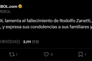 體育資訊9月30日訊 國米、阿根廷名宿薩內蒂的父親在不久前去世,南美足聯(lián)也發(fā)推表示了哀悼。