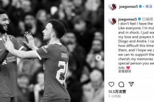 體育資訊7月4日訊 利物浦前鋒若塔因車禍去世,年僅28歲。隊友喬-戈麥斯通過社媒送上悼念: