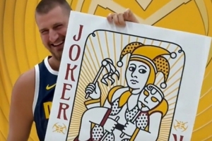 拍攝現(xiàn)場(chǎng),約基奇先后手拿迷你撲克牌和超大撲克牌,掘金官方配文:新賽季從“小王”進(jìn)化為“大王”。