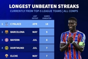 體育資訊10月1日訊 根據(jù)德轉(zhuǎn)統(tǒng)計,水晶宮是五大聯(lián)賽當(dāng)前各項賽事不敗場次最多的球隊,他們自4月以來已經(jīng)跨賽季18場不敗。