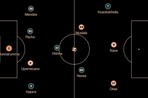 中場:穆西亞拉、維蒂尼亞、若奧-內(nèi)維斯