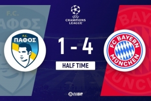 上半場沒有傷停補時,半場結(jié)束,拜仁暫4-1帕福斯。