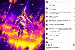 本場(chǎng)比賽格列茲曼打進(jìn)一球,達(dá)成馬競(jìng)生涯200粒進(jìn)球里程碑。賽后他也在個(gè)人社媒曬出海報(bào),寫道:“身披這件球衣慶祝進(jìn)球是一種榮幸,而能夠200次做到這一點(diǎn)則是夢(mèng)想成真。感謝所有球迷!”