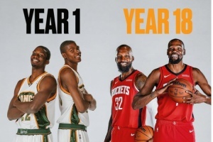 杰夫-格林與杜蘭特在2007年同年進入聯(lián)盟,兩人在超音速/雷霆做了三年半的隊友。今夏,杜蘭特加盟火箭,兩人再成隊友。