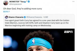火箭隊(duì)球員伊森的母親轉(zhuǎn)發(fā)相關(guān)報(bào)道,評(píng)論道:“我的天哪,他們加了更多的‘咖喱’(Curry)?!?/p>