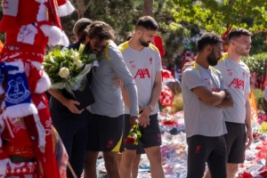 體育資訊7月12日訊 利物浦全隊及工作人員在安菲爾德向若塔和安德烈-席爾瓦表示哀悼,與兩位兄弟的家人一同緬懷。