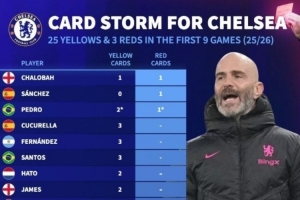 體育資訊10月1日訊 德國轉(zhuǎn)會市場統(tǒng)計,切爾西新賽季前9場比賽,領(lǐng)到25張黃牌和3張紅牌。
