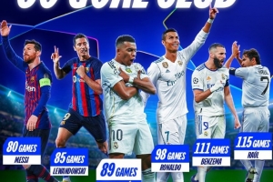 歐冠官方也盤(pán)點(diǎn)了歷史上打進(jìn)歐冠60球最快用時(shí)場(chǎng)次榜,具體如下: