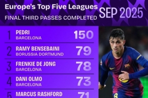 歐洲5大聯(lián)賽9月進攻3區(qū)成功傳球:佩德里150次第1,本塞拜尼79第2